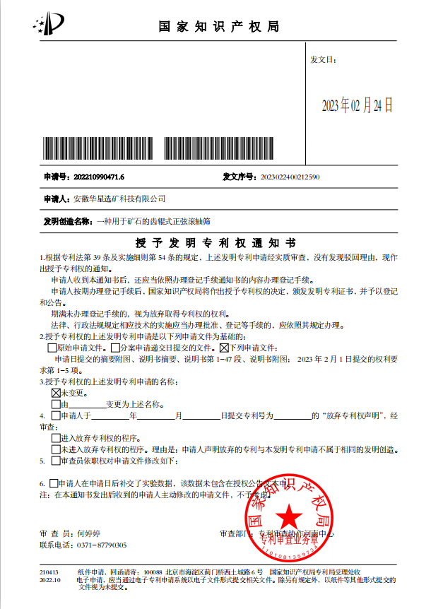近日,華星公司“一種用于礦石的齒輥式正弦滾軸篩”新產品順利通過國家知識產權局審查,正式獲得國家發明專利授權。